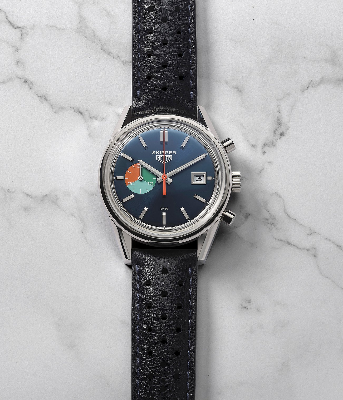 The Heuer reference 7754 has served as inspiration for the limited edition of 125 example of the 2017 Heuer Carrera Skipper. Co-designed by HODINKEE it served to commemorate the 50th anniversary of Emil Mosbacher’s victory at America’s Cup. A homage but not a carbon copy, the present Hodinkee Skipper incorporates key favourite design elements of the original 7754. The iconic faceted lugs, taken from the Carrera’s design features have been maintained thanks to a more modern "Glassbox" case which re-creates the vintage looks of a plexiglass. The original colour combination from the "Intrepid" has also been preserved, however a date window was added where the original version did not have one.