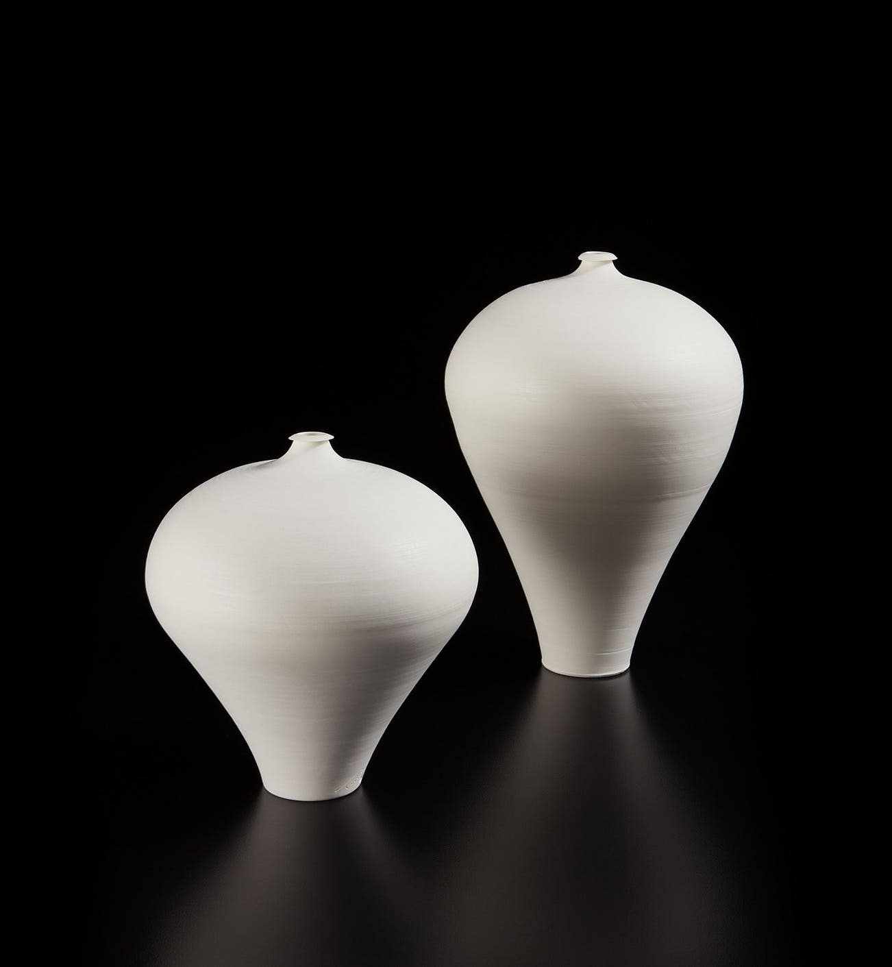Each impressed with artist's seal and incised Taizo. Underside of taller vessel with sticker, 13 and underside of shorter with sticker, 22. Each together with custom kiri wood boxes, inscribed in pencil with artist's name and date. Each box ink-stamped with artist's seal and 白磁花入 (white porcelain flower vase).
