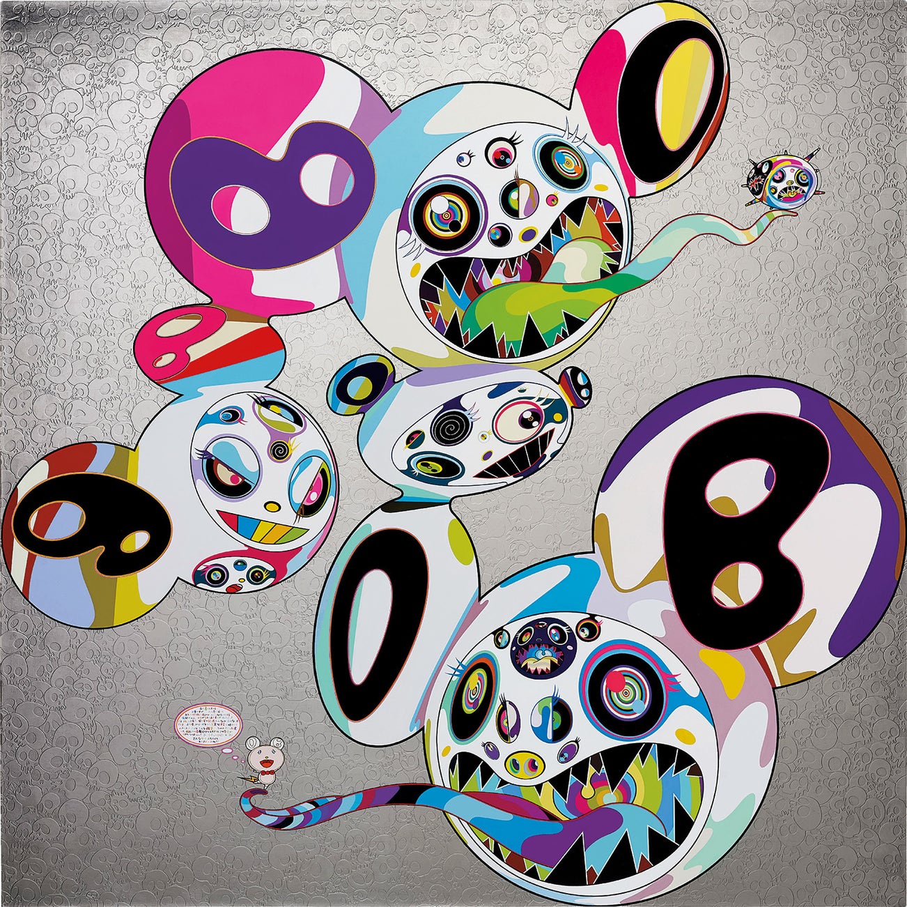 Psychedelic, fantastical and sharp-toothed, Mr. DOB was doubtlessly inspired by the anime and manga characters that achieved cult status amongst Japanese youth in the 1990s. Musing on the importance of the icon, Murakami declared that ‘…it felt like I had succeeded…Once a character is born and begins to move, I think one has to follow its demands. If you let it be, it will take care of itself…Now I have a face that can transform at will’ (Takashi Murakami, quoted in Murakami: Ego, exh. cat., Al Riwaq, Doha, 2012, p. 18). Expertly mixing high and low art, Murakami has employed Mr. DOB throughout his career to examine the complexities of Japan’s cultural history. In 727, painted in 1996 and now residing in New York in the Museum of Modern Art’s collection, Mr. DOB rides a wave that is visually evocative of Hokusai’s infamous woodblock prints, created in the first half of the 19th century. Eluding this art historical context, Spiral instead focuses on its depicted characters, presenting them as literally ‘spiralling’ out of control and bursting out from the picture plane. More menacing than adorable, the bear-like Mr. DOBs appear crazed in a psychedelic flurry of shapes and colours, mutating 727’s tranquil waves into twisting tongues.