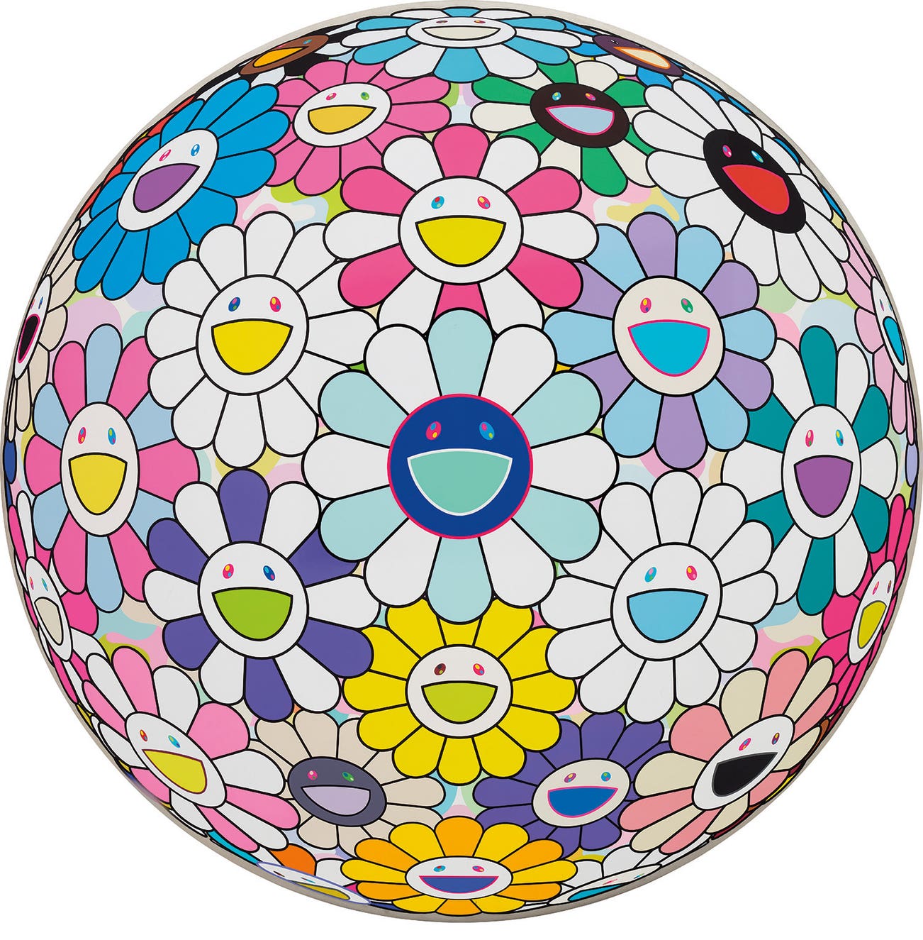 Varying in size and colour, the countless smiling buds of the present work seem to bleed onto an invisible horizon, expanding beyond their visible sphere. Musing on the symbol of flowers and how they became an integral part of his work, Murakami declared: ‘When I was preparing for the entrance exams for the University of Fine Arts, I spent two years drawing flowers. I drew some every day. And the entrance exam in the Nihonga section also involved flower drawing. Afterwards, to earn a living, I spent nine years working in a preparatory school, where I taught the students to draw flowers. Once every two days, I would buy flowers for my lesson and make compositions for the students to work on. […] Each one seems to have its own feelings, its own personality’ (Takashi Murakami, quoted in Takashi Murakami, exh. cat., Fondation Cartier pour l'art contemporain, Paris, 2002, p. 84). Typically painted with proportional dimensions and great attention to detail, Murakami’s flowers became a leitmotif of his various artistic outputs – in painting, but also sculpture. For the present work, the artist’s technique is reminiscent of Andy Warhol’s within the context of his factory. Like Warhol, Murakami has employed the assistance of painters within his factory-sized studio in Miyoshi Kaikai Kiki Co. From a total of three hundred assistants in his company, fifty are dedicated exclusively to painting, very clearly and precisely materialising his painterly vision.