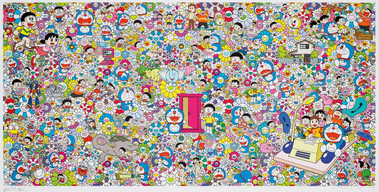 In the 1990s, Murakami founded the Superflat movement in an attempt to expose the "shallow emptiness of Japanese consumer culture." The artist plays on the familiar aesthetic of mangas, Japanese-language comics, to render works that appear democratic and accessible, all the while denouncing the universality and unspecificity of consumer goods. True to form, Murakami has done collaborations with numerous brands and celebrities including Kanye West, Louis Vuitton, Pharrell Williams and Google.