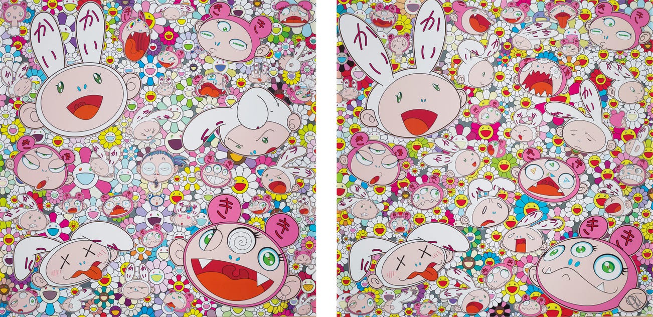 In the 1990s, Murakami founded the Superflat movement in an attempt to expose the "shallow emptiness of Japanese consumer culture." The artist plays on the familiar aesthetic of mangas, Japanese-language comics, to render works that appear democratic and accessible, all the while denouncing the universality and unspecificity of consumer goods. True to form, Murakami has done collaborations with numerous brands and celebrities including Kanye West, Louis Vuitton, Pharrell Williams and Google.