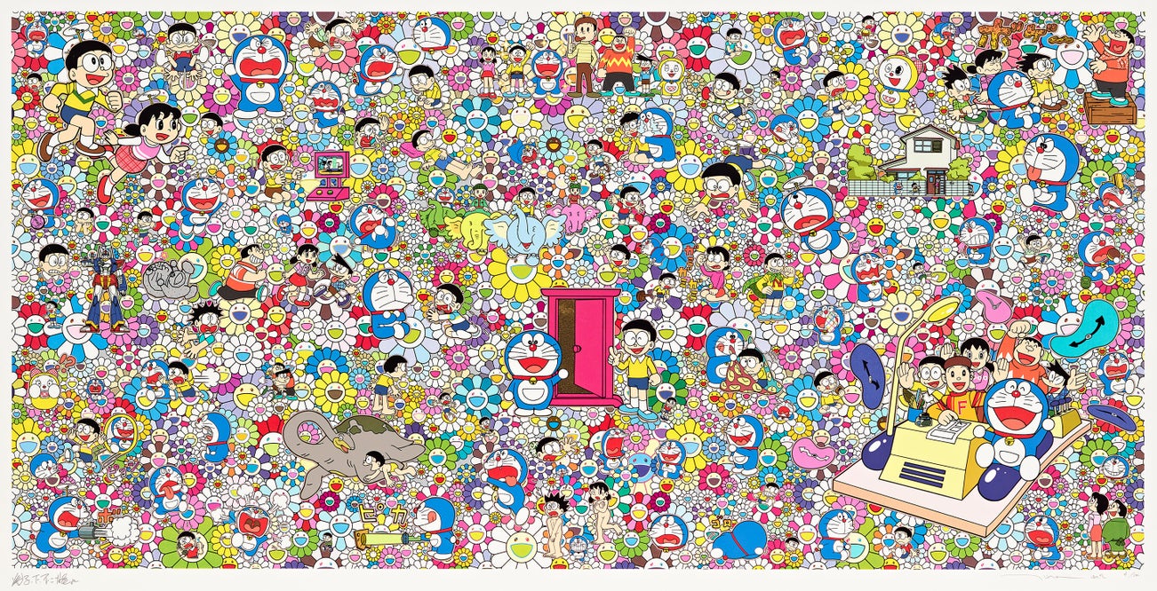 In the 1990s, Murakami founded the Superflat movement in an attempt to expose the "shallow emptiness of Japanese consumer culture." The artist plays on the familiar aesthetic of mangas, Japanese-language comics, to render works that appear democratic and accessible, all the while denouncing the universality and unspecificity of consumer goods. True to form, Murakami has done collaborations with numerous brands and celebrities including Kanye West, Louis Vuitton, Pharrell Williams and Google.