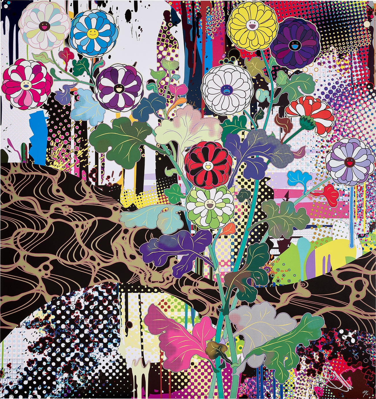 In the 1990s, Murakami founded the Superflat movement in an attempt to expose the "shallow emptiness of Japanese consumer culture." The artist plays on the familiar aesthetic of mangas, Japanese-language comics, to render works that appear democratic and accessible, all the while denouncing the universality and unspecificity of consumer goods. True to form, Murakami has done collaborations with numerous brands and celebrities including Kanye West, Louis Vuitton, Pharrell Williams and Google.