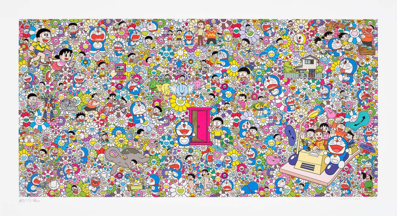 In the 1990s, Murakami founded the Superflat movement in an attempt to expose the "shallow emptiness of Japanese consumer culture." The artist plays on the familiar aesthetic of mangas, Japanese-language comics, to render works that appear democratic and accessible, all the while denouncing the universality and unspecificity of consumer goods. True to form, Murakami has done collaborations with numerous brands and celebrities including Kanye West, Louis Vuitton, Pharrell Williams and Google.