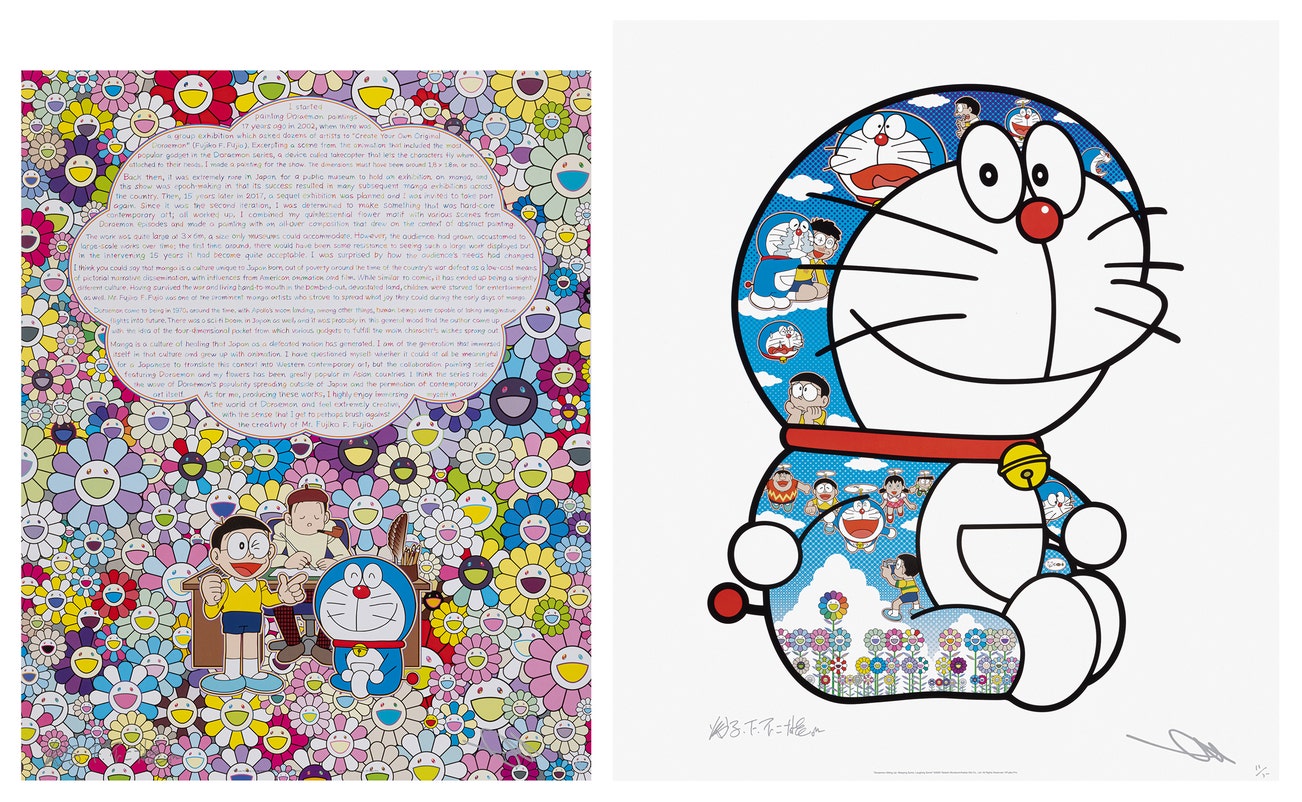 In the 1990s, Murakami founded the Superflat movement in an attempt to expose the "shallow emptiness of Japanese consumer culture." The artist plays on the familiar aesthetic of mangas, Japanese-language comics, to render works that appear democratic and accessible, all the while denouncing the universality and unspecificity of consumer goods. True to form, Murakami has done collaborations with numerous brands and celebrities including Kanye West, Louis Vuitton, Pharrell Williams and Google.