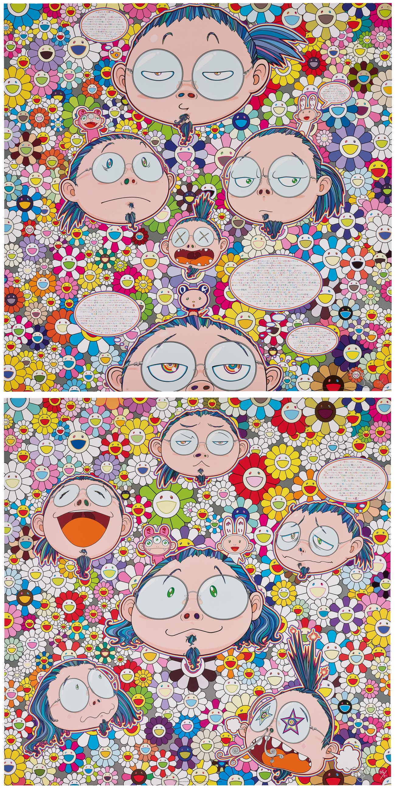 In the 1990s, Murakami founded the Superflat movement in an attempt to expose the "shallow emptiness of Japanese consumer culture." The artist plays on the familiar aesthetic of mangas, Japanese-language comics, to render works that appear democratic and accessible, all the while denouncing the universality and unspecificity of consumer goods. True to form, Murakami has done collaborations with numerous brands and celebrities including Kanye West, Louis Vuitton, Pharrell Williams and Google.