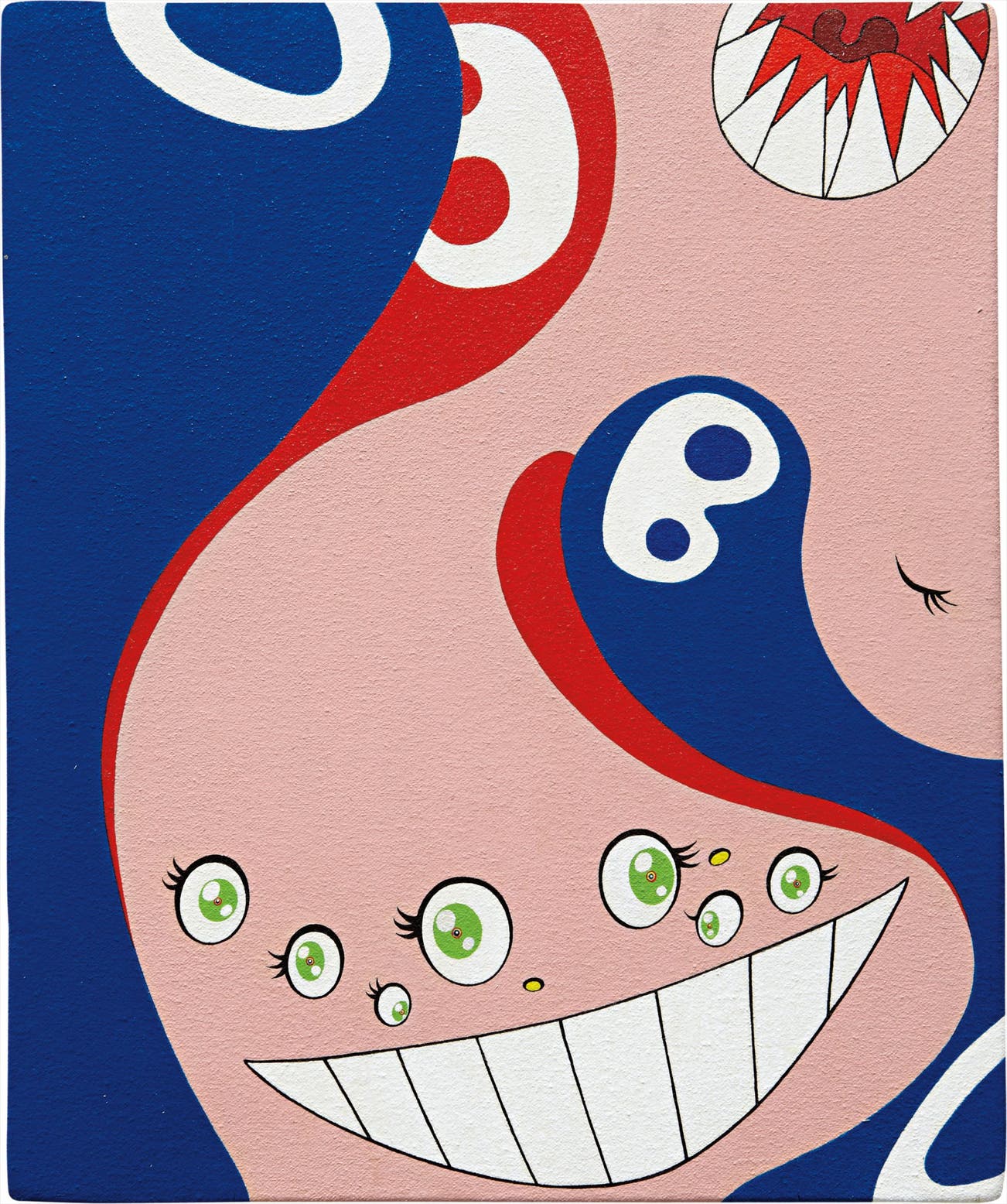 The present lot, Untitled, 1997, serves as an early example of Murakami’s “Superflat” work, a term he coined to describe the flat, two-dimensional imagery customary in Japanese art that emphasizes surfaces and flat planes of color. As a term, "superflat" is Murakami's way of marrying high art and the commercialism, as both traditions embrace this particular style; hence, "superflat" is Murakami's great equalizer. Untitled, 1997, also displays similarities to older traditions of Japanese art: the curved lines that form the mad figure are themselves reminiscent of Japanese woodcuts, while the character itself evokes the fantastical creatures that made frequent appearances in the ancient paintings of Japan. But as opposed to the horrifying dragons and mythical beasts that dotted the halls of Medieval palaces, here we find an many-eyed grin that we cannot help but adore. All in all, Murakami has stepped beyond the commercial achievements of a contemporary pop artist and instead found himself at the center of a cross-cultural exchange of artistic values. The present lot is both old and new: a memory of the past, a symbol of the present, and a vision of the future.