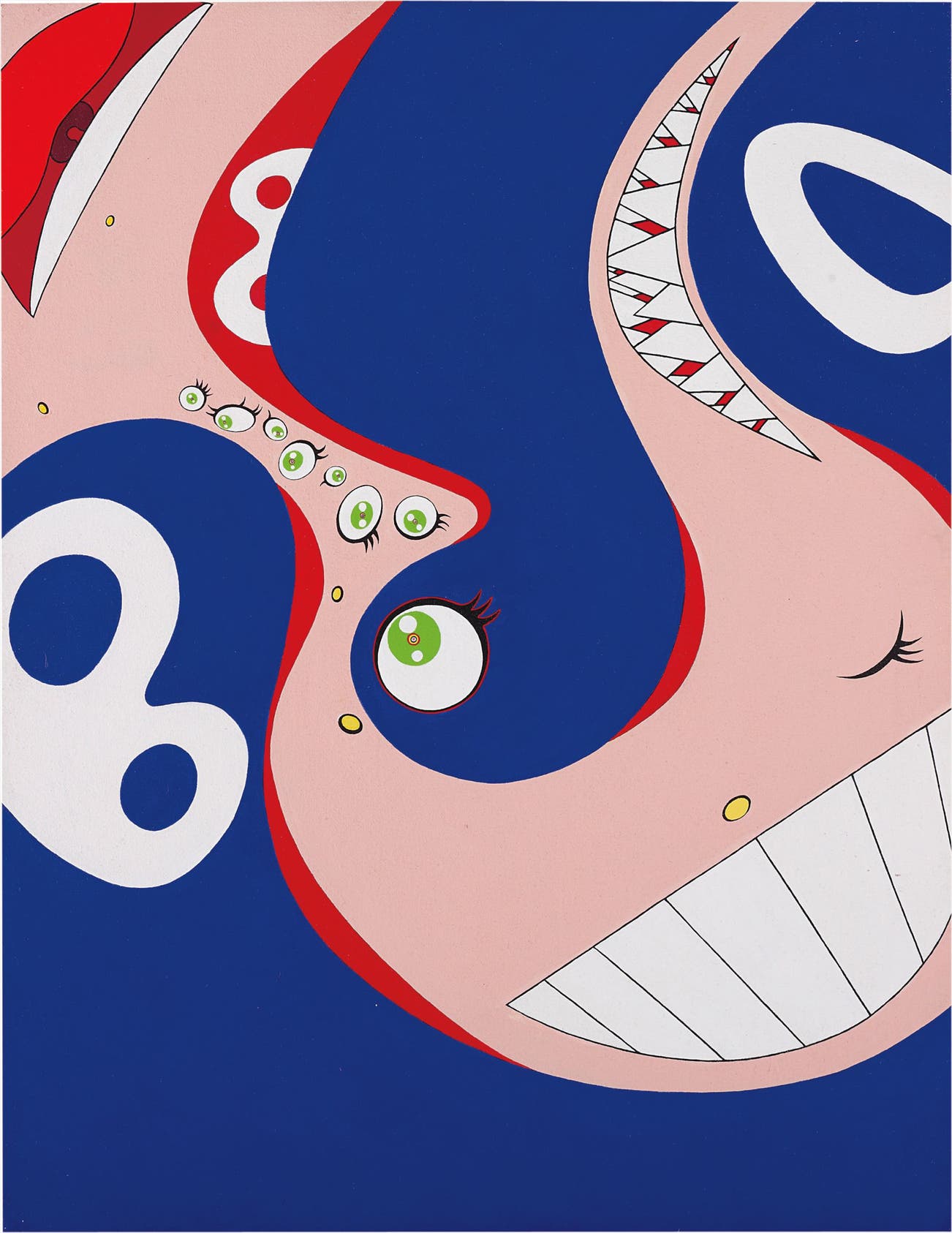 In Born to Kill!, 1997, Mr. DOB seems to have melted, morphed, and multiplied. It is as if one of Murakami’s Mr. DOB inflatables has been deformed and pushed against a window, its features now restructured into an enigmatic tangle. Murakami’s idiosyncratic character is still easily recognizable, despite the changes in form and personality. Characteristic of Murakami’s pop-infused “superflat” style, the present lot displays a schizophrenic realization of space. The letters “D” and “B” in white flank the face that is shaped like an “O”, spelling out “DOB” upside-down amongst the corporal remains of the animated figure. Whimsical smiles are met with devious grins, while bright eyes have abandoned their anatomical function on the face to participate in a fluid medley of line and colour. Rendered in bright on a fat surface, Born to Kill! is vibrant and inviting, fantastically exhibiting how Murakami has generated a universal infatuation with the buoyant and lighthearted Mr. DOB.