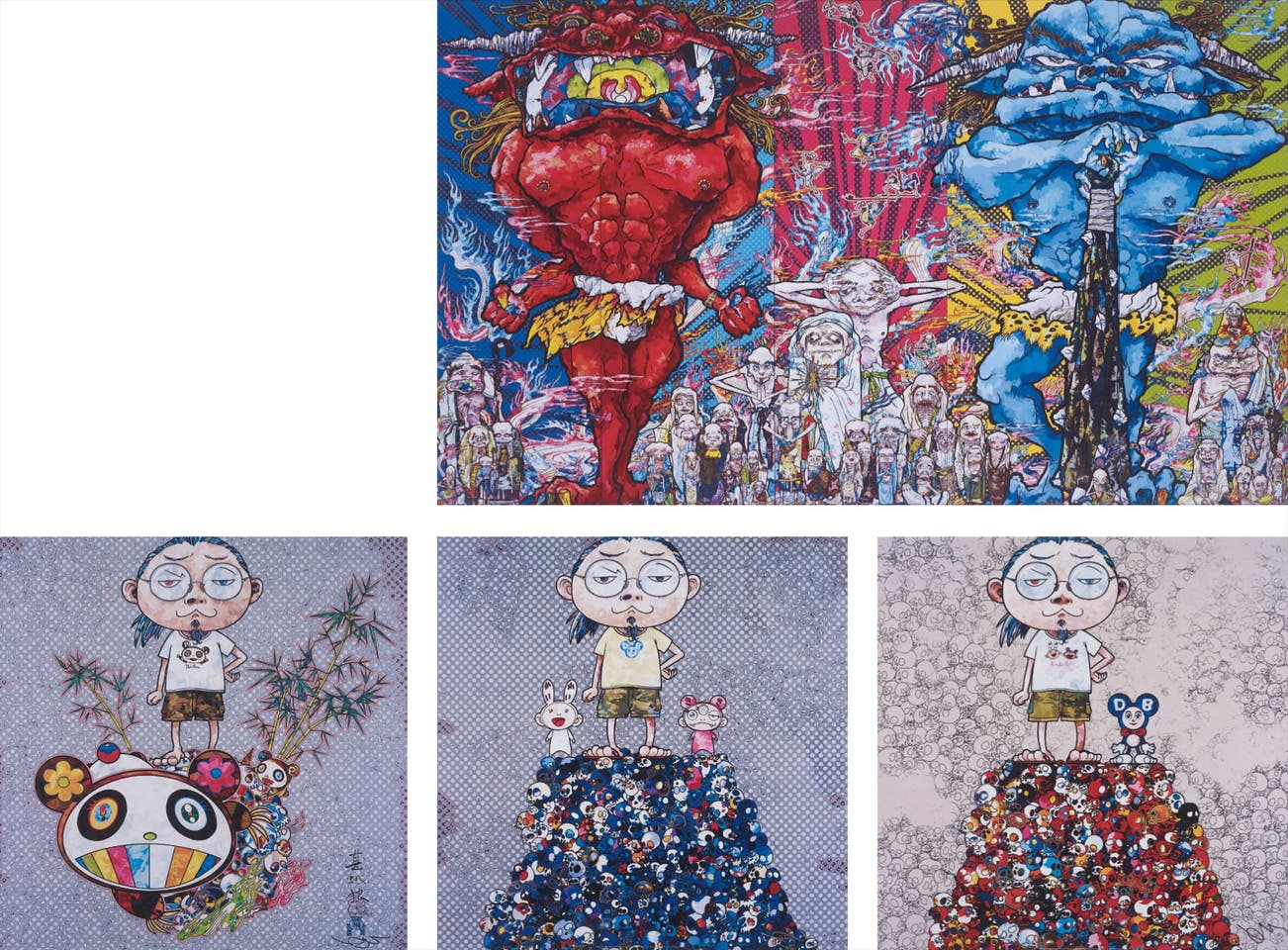 Red Demon and Blue Demon with 48 Arhats; I Met a Panda Family; Kaikai Kiki & Me: On the Blue Mound of the Dead; and DOB & Me: On the Red Mound of the Dead