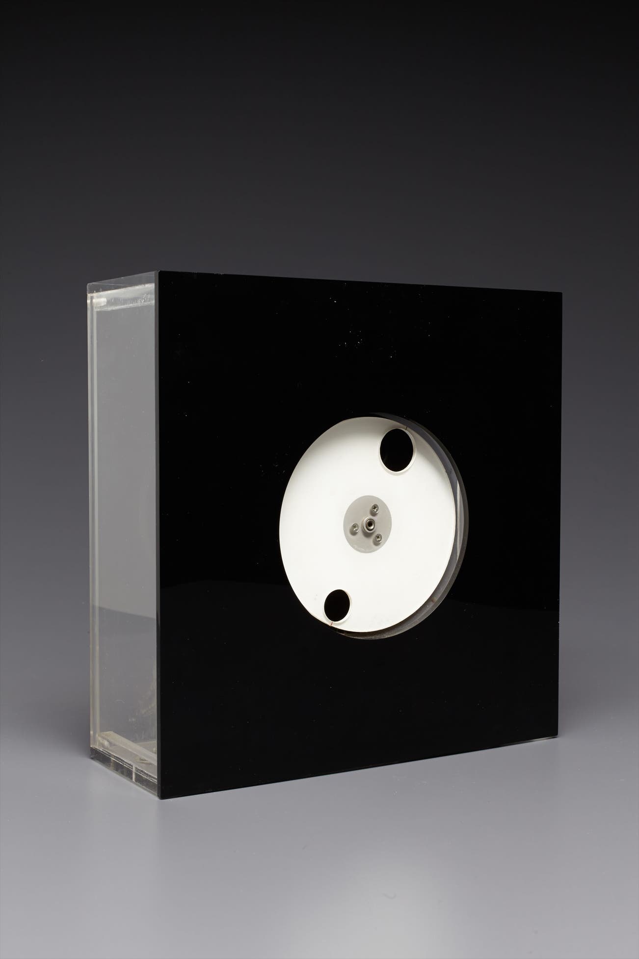 Black and clear Plexiglas with electromagnets and motorized rotating white disc,