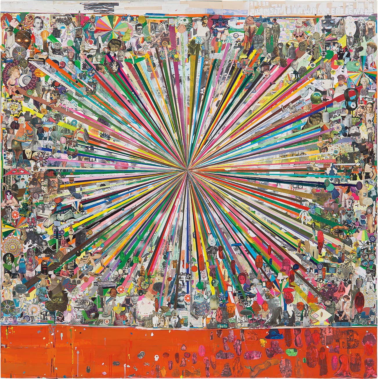 printed paper collage, paper collage, acrylic, aluminium foil, wax crayon, biro, colouring pencil, fabric and glitter on paper mounted on board