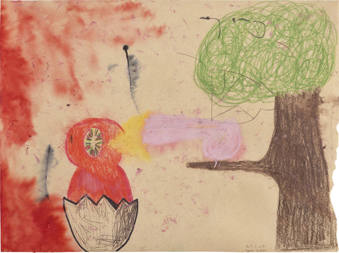 Unique crayon, gouache and ink drawing in colors, on wove paper.