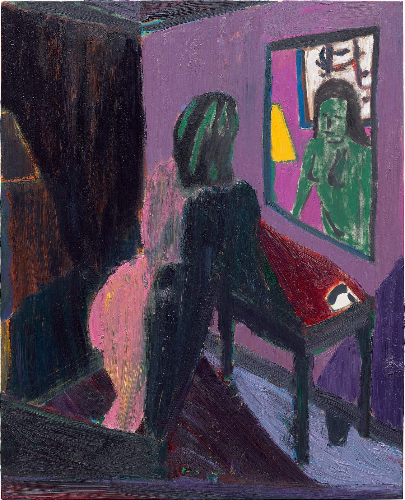 signed with the artist's initials, partially titled and dated 'T.R Telephone mirro" 14 Tal R' on the overlap; inscribed and partially titled 'Girl Telefone Mirror The telefone' on the stretcher