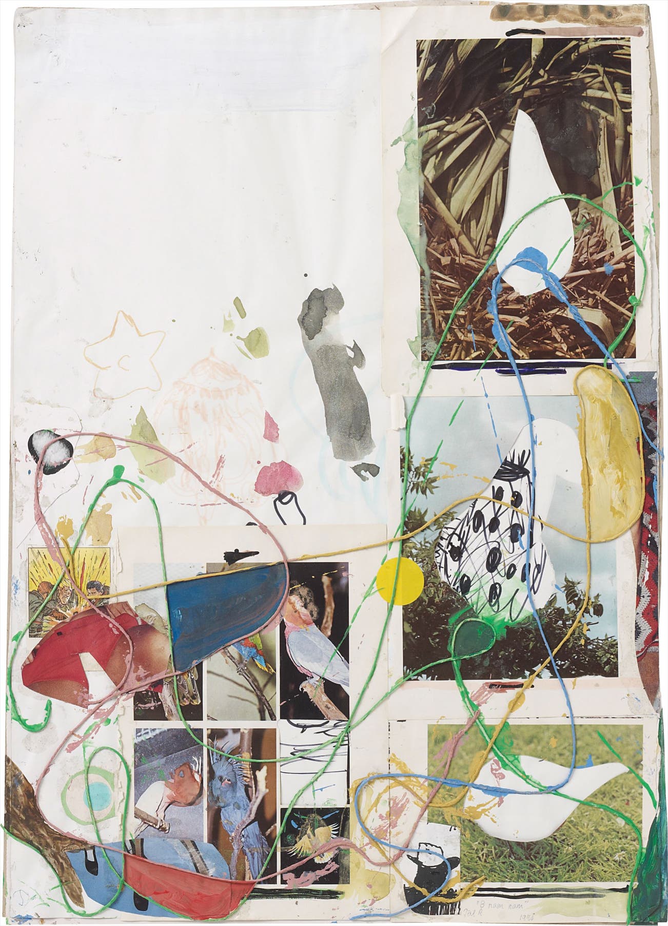 collage, acrylic, felt-tip-pen, cord on paper