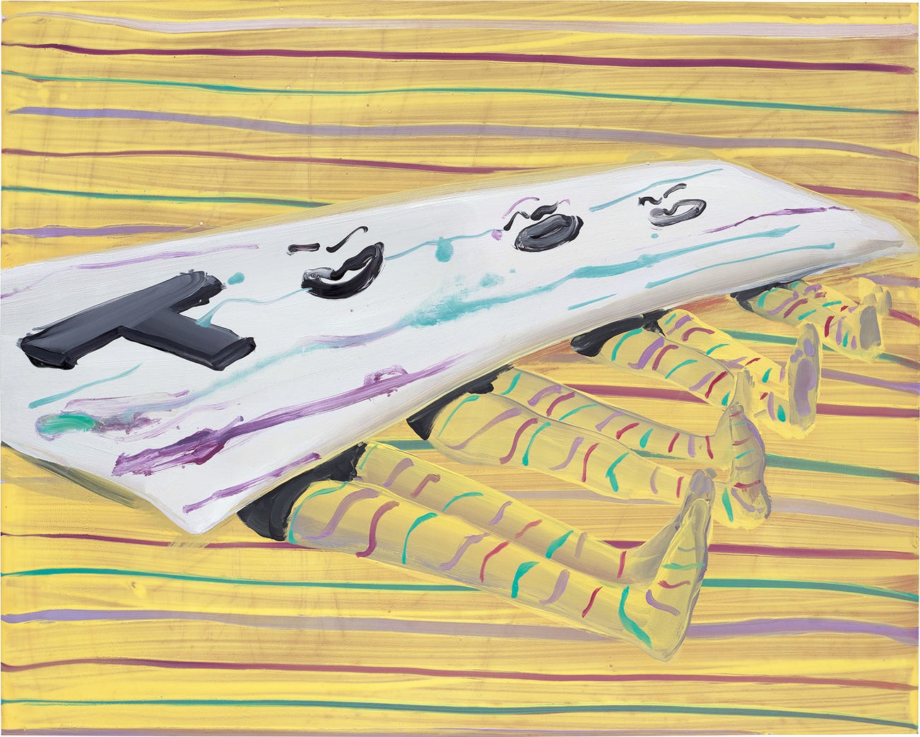 Executed in 2010, Tala Madani’s Imprint II subsumes us into the artist’s surreal painterly world. Created in the year preceding her seminal show at the Stedelijk Museum Bureau, Amsterdam, in the present work the viewer encounters the feet of four figures lying down, half hidden by a white covering daubed with illegible text-like black shapes, the first forming the letter ‘T’. With colourful stripes spanning the length of the composition, the figures’ socks mirror the colourful background artist of yellow, red, purple and turquoise, imbuing the work with vitality and vibrancy. Provoking a humorous response with her uncanny imagery, Madani toys with infantilizing her protagonists, playing with our associations with comedy, societal norms and shame. The importance of her progressive oeuvre has been further cemented in the recently acclaimed exhibition, Radical Figures: Painting in the New Millennium hosted at Whitechapel Gallery, London.