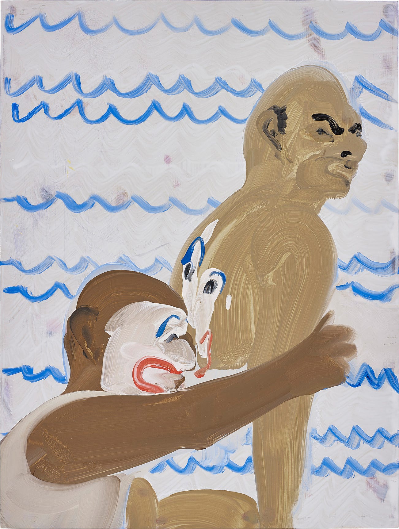 The present work belongs to Tala Madani’s Dazzle Men series, first exhibited at Pilar Corrias, London, in 2009. The title of the series refers to Dazzle Ships or Dazzle Camouflage, a technique employed in World War I to confuse the targeting of U-Boat commanders. War ships were decorated with complex patterns of geometric shapes in contrasting colours, which interrupted and intersected each other; instead of concealing the ships, the intention was to dazzle and mislead the enemy. This technique was linked to the contemporaneous avant-garde art scene, with artists such as Edward Wadsworth overseeing the design and painting of 2,000 ships. In her works from the Dazzle Men series, Madani has employed her dark humour to create uncanny mise-en-scènes, featuring groups of bald men in varying sizes, engaged in absurd attempts at camouflage which manifest in playful and often perverse microcosms.