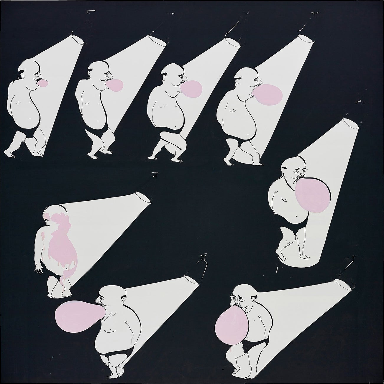 An expansive canvas from Tala Madani’s progressive body of work, The Bubble was painted in 2012, the year preceding the artist’s solo exhibition Rip Image at Moderna Museet Malmö which later toured to Moderna Museet Stockholm, and shortly followed her 2011 show at the Stedelijk Museum Bureau, Amsterdam. Celebrated alongside leading contemporary artists at the Whitney Biennal in 2017, Madani’s body of work creates a unique visual space where desires are unfettered, and restrictions are relinquished; the artist depicts largely male protagonists who engage in exaggerated performances, which appear at times sexual, violent or comic. In the present work, the viewer follows the procession of a bald, partially disrobed middle-aged man around the canvas, the artist capturing each stage of his journey to blow a comedic bubble with pink gum. Provoking a humorous response with her uncanny canvasses, Madani’s protagonists are often infantilized and made absurd through their base and degrading behaviours.
