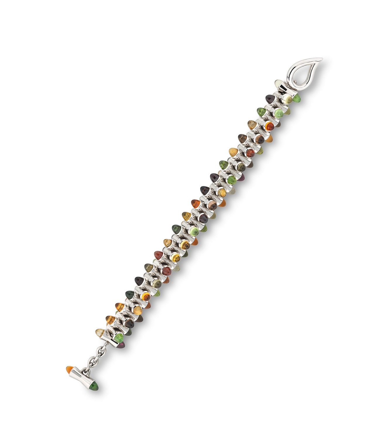 Set as a continuous row of bullet-shaped links, set with rutilated quartz, peridot, citrine, and smoky quartz cabochons, length approximately 210mm, maker's mark for Tamara Comolli.