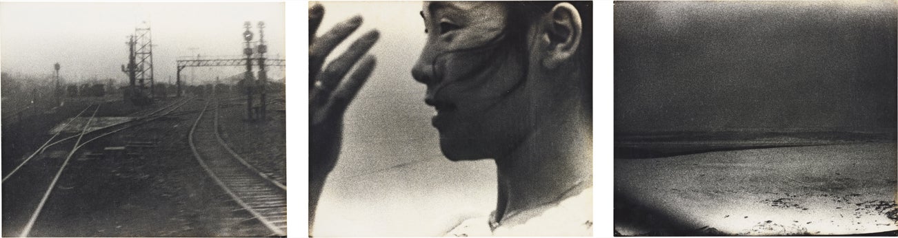 The left image of empty railway tracks was taken in spring 1971 in Asahikawa, Hokkaidō, the northernmost of Japan’s four main islands. Of this photograph, Nishimura remembers, ‘I was fascinated by the open landscape. Looking at the empty tracks, I imagined that the end of the line was Cape Sōya, the northernmost point of the island of Hokkaidō.’ The young woman in the centre was taken in summer 1970 in Aomori prefecture in Tōhoku region of Northeast Japan. She recalls, ‘I was photographing while in a taxi using a telephoto lens. When the taxi stopped at a red light, a face of a woman standing on the pavement jumped into my frame and I pressed the shutter. It was a fleeting moment so this is the only shot.’ On the right is an almost abstract seascape taken in winter 1970 in Ishikawa prefecture in Hokuriku region of Northwest Japan. She visited the Uchinada sand dunes, where this image was shot, to see the relics of the ammunition storage facilities, which played a part in the 1952 ‘Uchinada Battle’ and the ensuing anti-US military base campaign.