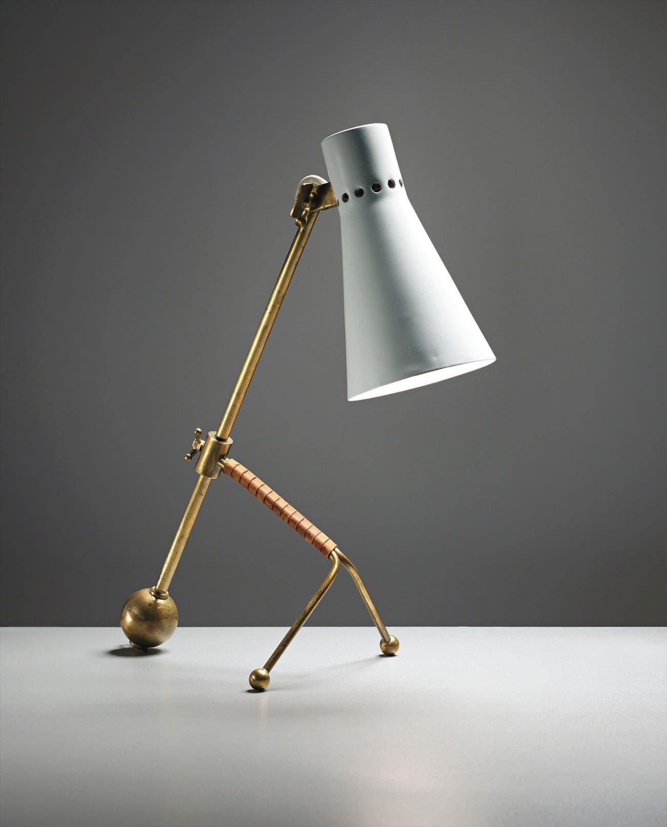 Tubular brass, leather-bound tubular brass, brass, painted aluminium.
