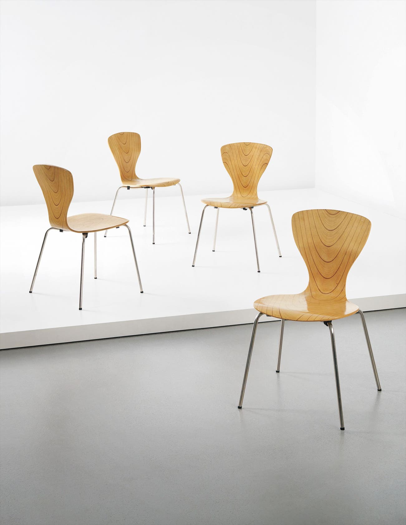 Rhythmic laminated-birch plywood, nickel-plated tubular steel, rubber.
