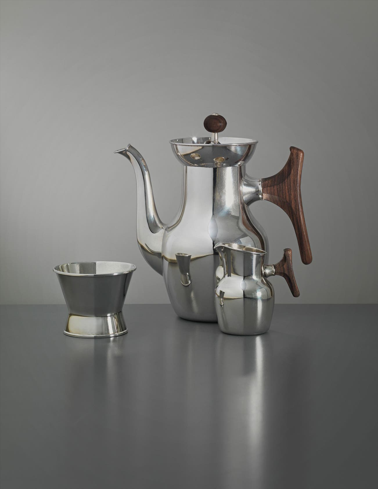 Coffee pot: 21.3 x 21.5 x 11.5 cm (8 3/8 x 8 1/2 x 4 1/2 in.); milk jug: 8.6 x 8.5 x 6.5 cm (3 3/8 x 3 3/8 x 2 1/2 in.); sugar bowl: 6.4 cm (2 1/2 in.) high, 8.2 cm (3 1/4 in.) diameter