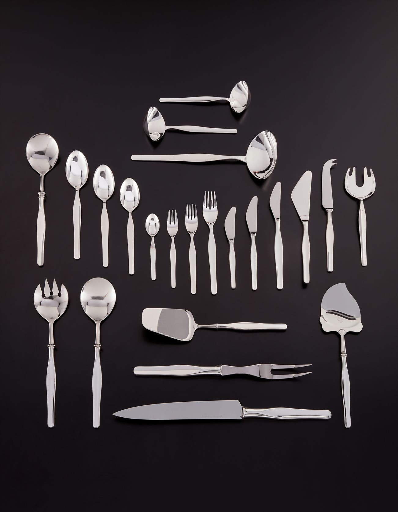 Forks, spoons, ladles, and two serving pieces: silver. Knives and other serving pieces: sterling silver, stainless steel.