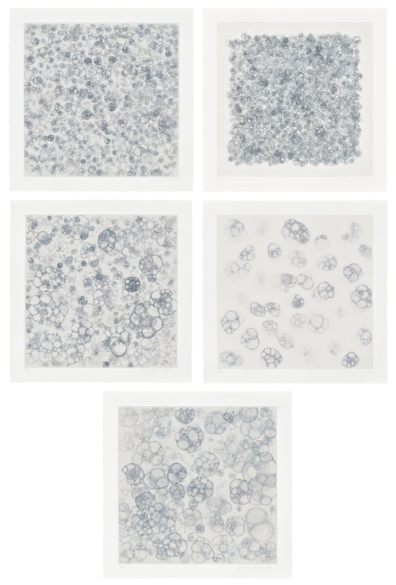 “To form the burst of bubbles in [these prints], Donovan used a straw to blow air into a mix of ferric chloride solution and liquid soap; she then picked up the bubbles with a spoon and laid them on a copper plate prepared with an aquatint ground She left the bubbles on the plate until they popped or dissolved, making grooves of varied depths that created sections of lighter or darker tones when printed. The resulting composition playfully preserves an otherwise ephemeral phenomenon.”