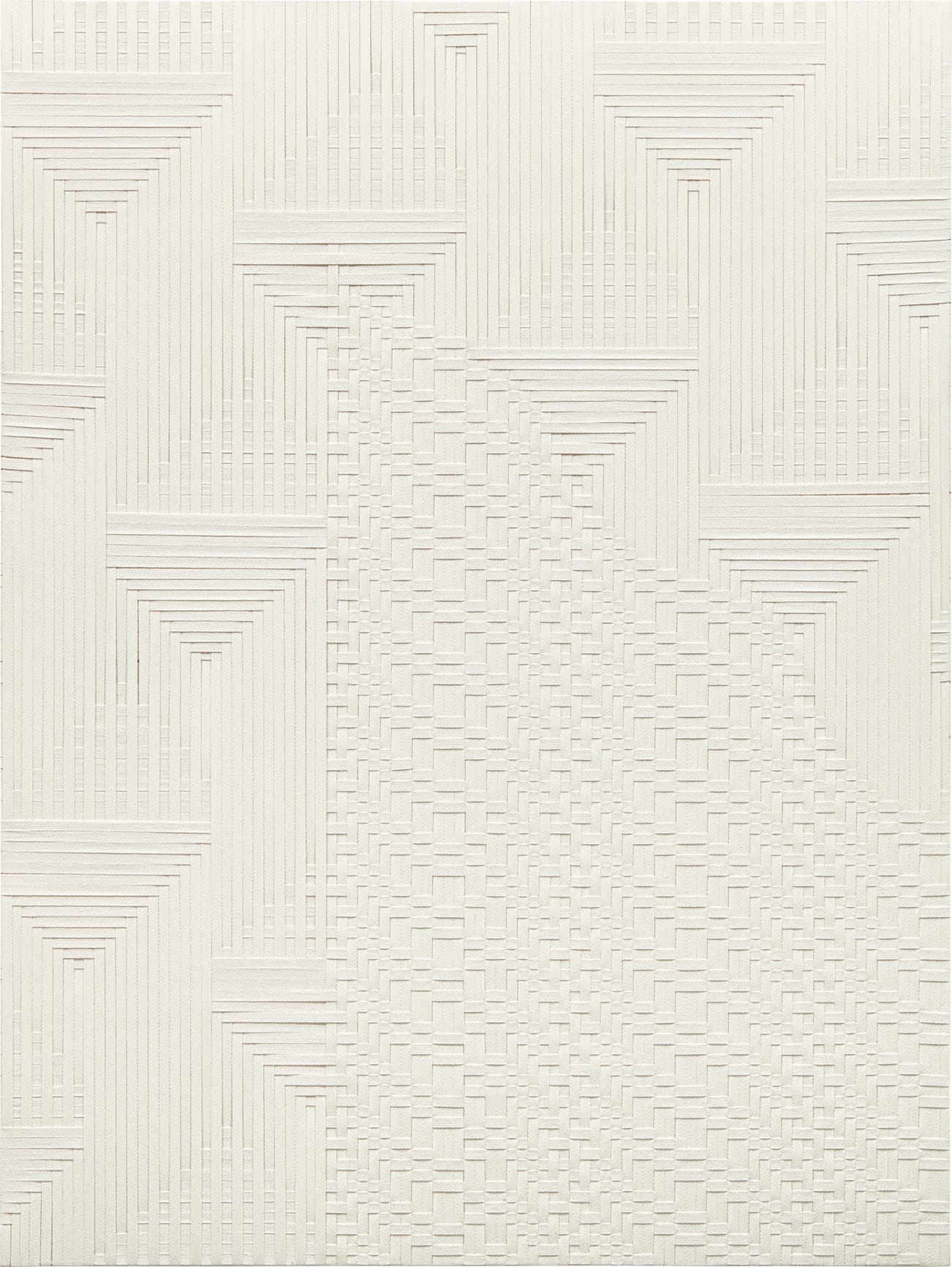 An integral body within her oeuvre, the Weave works were included in her major solo institutional exhibition, Tauba Auerbach: Tetrachromat, which began at Bergen Kunsthall in 2011 and concluded at the Wiels Contemporary Art Centre in Brussels in 2013. Slice V is a stunning example from the series, rendered in a multi-planar ivory canvas strips. Each strip alternates on top and beneath the next, as if coexisting in the new dimension that Auerbach has created. By harkening back to the traditional craft of weaving, the artist uniquely bridges the past and the present in her own futuristic space. “Weaving is one of our oldest technologies,” she has stated, “but it has an inherent esthetic and structural link to our newest, digital technologies. That continuity excited me.” (Tauba Auerbach, quoted in Courtney Fiske, “Tauba Auerbach’s Peripheral Visions”, Art in America, June 21, 2012, online)