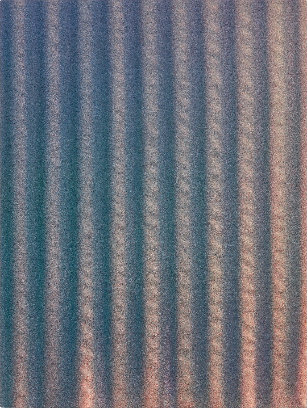 “To create these works, I contort and fold the canvas, ironing it or letting it sit under weights to set the creases. After a few days I loosely spread the creased fabric on the floor and spray it directionally with acrylic paint put through an industrial house paint sprayer—a process in which pigment acts like raking light. When the paint is dry I stretch the canvas taught. The resulting flat surface carries a near-perfect record of the canvas’s previous three-dimensional self; the surface still appears wrinkled or folded. This is my take on trompe-l’oeil or traditional realistic painting, one that relies on strategy rather than virtuosity.” Tauba Auerbach