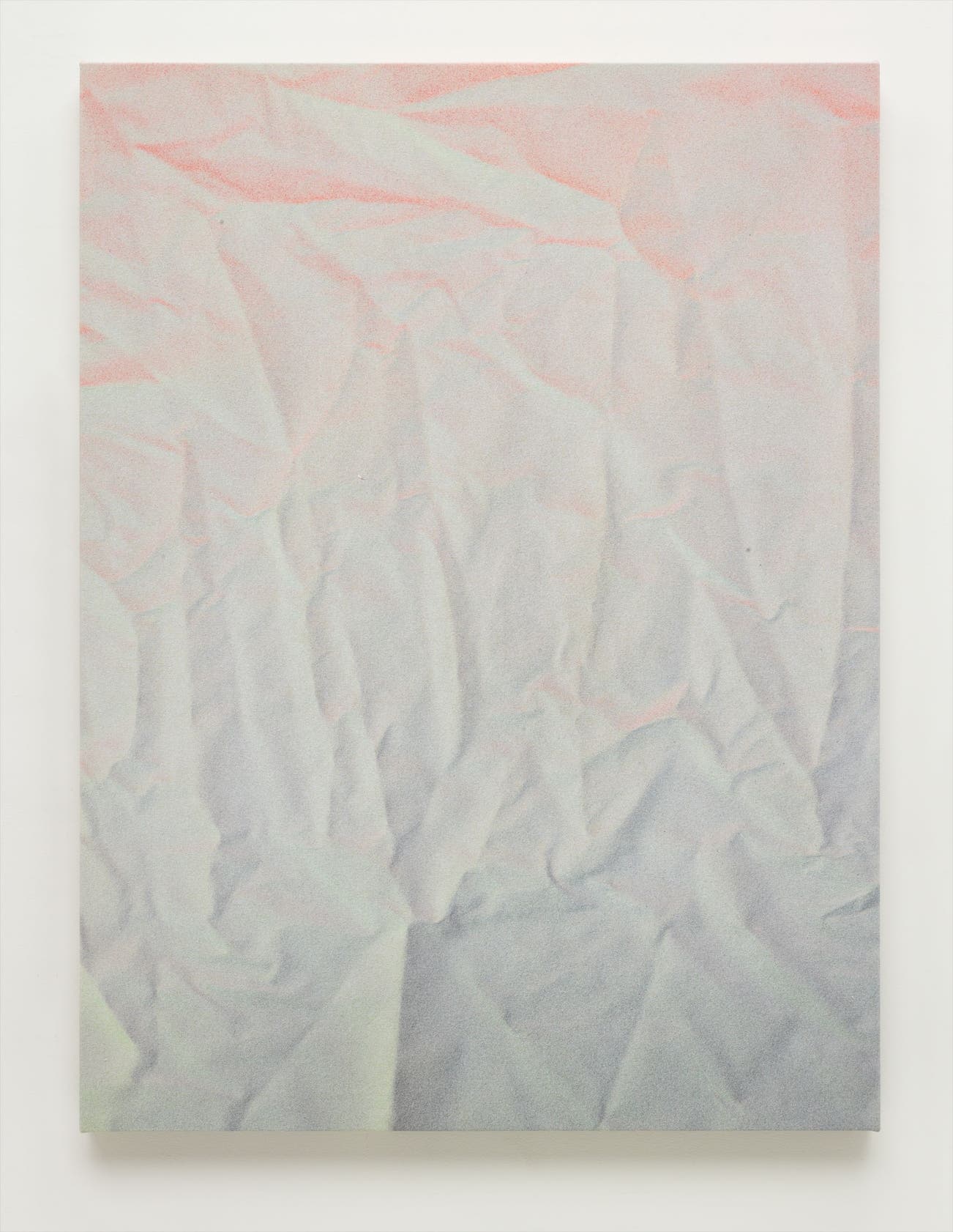Alluring and hypnotic, Auerbach’s fold paintings investigate what the artist refers to as the ‘2.5th dimension’, one that oscillates between the flat panelled two dimensional they lay on and the three dimensional illusion they construct. The fascinating process used to produce these compositions reaffirms the artist’s physical manipulation of the canvas by folding and rolling it. The canvas is subsequently laid on a flat plane, ironed, and its surface painted using an industrial spray gun at different angles to capture the nuance of the folds with the colour. The outcome is a mesmerizing painting with a spectrum of colours that emphasizes a ‘modern day’ trompe l’oeil effect. From afar, the work is characterised by volume, shadows and an undulating surface of wrinkled fabric; however on closer inspection, the folds wondrously fade away only to reveal a smooth canvas that is rigidly tightened over the stretcher. The present lot is given subtle blue and red celestial shades which, together with the magical three dimensional effect, transport the viewer in an inaccessible hyper-spatial reality where light has serendipitously come into existence.
