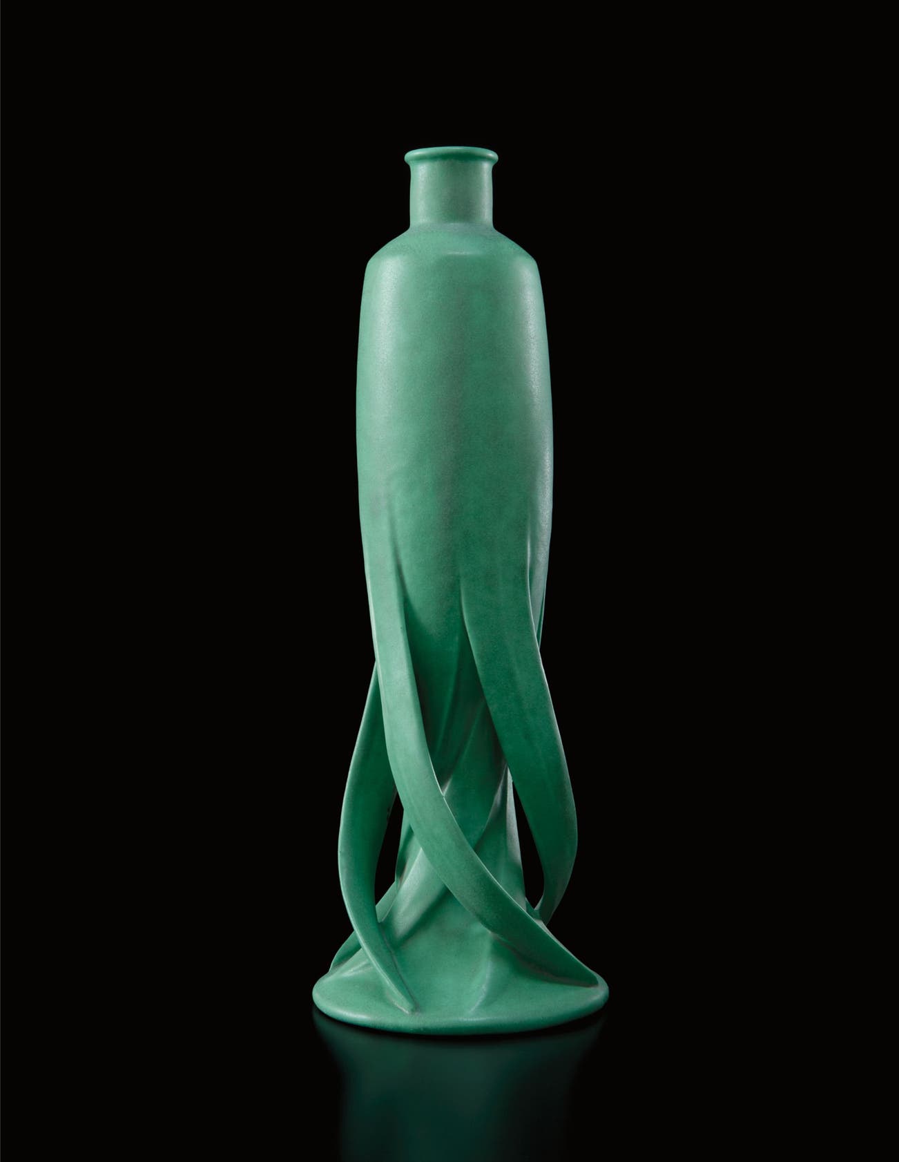 Setting Teco apart from its ceramic contemporaries, the company used innovative, economical mass-production methods: slip-cast molds which were then sprayed with glaze. The clay used was formulated for low-fire work and as such, Teco pots were not prone to shrinking, cracking or warping from firing – a development which allowed for the designers to create forms not possible with the high-fire clay typically found in decorative ceramics. The slender leaf-like forms winding around the base of the present lot were cut by hand away from a larger clay mold, a technical feat that would have cracked during firing with a different formula. Teco wares were fired using the same industrial processes as the large ornamental bricks, the soft matte glaze a result of the slow firing and cooling process intended for bulk architectural work. The designs of Teco pottery relied on imagery created within the form rather than applied to the form, which gave the designers freedom to produce works of architectonic or organic shape – each reflective of their individual sensibilities. In the case of Fritz Albert, the success of his designs lie in his ability to seamlessly blend industrial process with organic sculptural inspiration – a theme at the forefront of turn-of-the-century decorative arts and design.