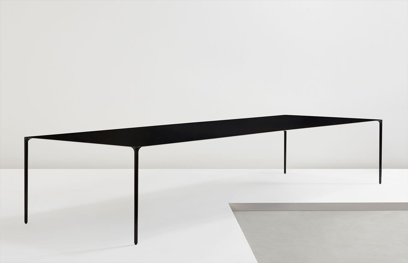 “A collaboration with F1 Design Engineer John Barnard RDI, who designed the very first carbon fibre F1 race car for McLaren. The table design began as an experimental project to exploit the unique properties of carbon fibre. Our concept was to take the design of a normal table, one with legs at each extreme corner, and to push it to the absolute. A table may be defined as a horizontal supported surface and we thought we should make it just that, a surface and not much more. The tapered legs blend smoothly into the 2mm thick wafer thin edge. Uniquely, the structural unidirectional carbon fibre is seen on the top surface. Constructed from high modulus carbon fibre formed and cured under elevated pressure and temperature in an autoclave.”