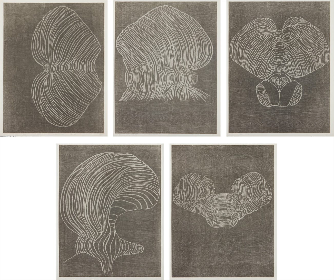 The complete set of five woodcuts in colors, on heavy wove paper, with full margins, all contained in the original hand-made paper portfolio designed by the artist and cardboard box.