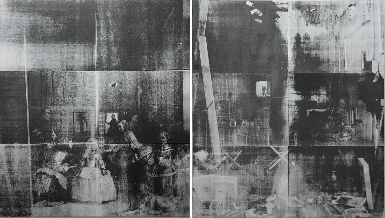 Formally, the black on silver silkscreening application of BHFQ’s Las Meninas serves as a visual allusion to Andy Warhol’s seminal silkscreens of the sixties. Work such as Silver Liz as Cleopatra reveal this art historical reference. By using visual codes, BHQF’s specific reference to Warhol is used to further articulate the role of the artist. Warhol serves as the clear precursor to the contemporary status of superstar artists with fame, celebrity and notoriety delineating key themes in Warhol’s work.