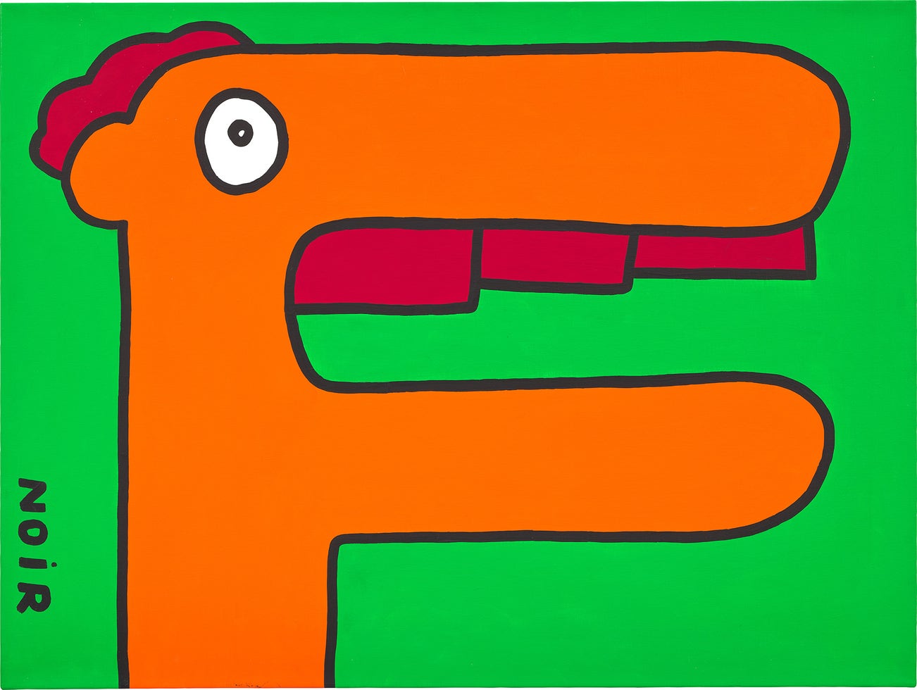 signed 'NOiR' lower left; further signed, dated and titled 'THIERRY NOIR 2015 "MY CROCODILE IS BACK TO HIS BEST. I AM SO HAPPY!"’ on canvas affixed to the overlap