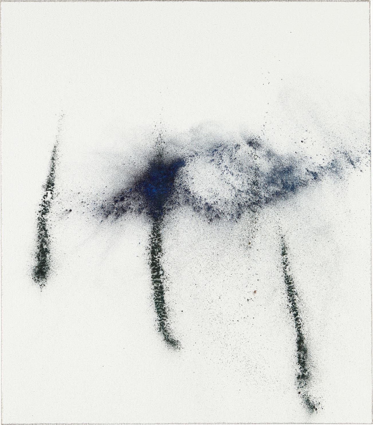 German artist Thilo Heinzmann’s artistic practice is dedicated to the exploration and recalibration of painting as a means of creative expression. In the current lot, the artist disperses powdered pigments in deep blue, brown and green tones across a nearly all-white canvas. A cloud of deep marine dust and three emerald streaks settle to convey a genuine, painterly flourish. The pigment ranges in its impression across the work, covering some areas only lightly, and transforming others with chromatic density.