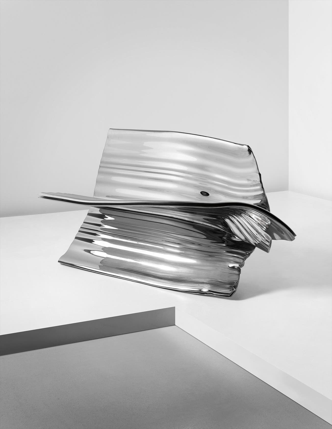 The present bench is the third extrusion by Thomas Heatherwick from a single billet of aluminum. Forced through a large die, the aluminum was cut into unique, unrepeatable sections and hand-polished. Waste from “Billet 7” was recycled for future extrusions. Heatherwick conceived his “Extrusion” benches over a twelve-year period dating from his coursework at the Royal College of Art, London. He had intended to create lengthy seating for public spaces such as airports and stations. The process of creating his “Extrusions” implies infinity. As Heatherwick states, he could conceivably produce a work that “reached around the planet to wherever it needed to go.”