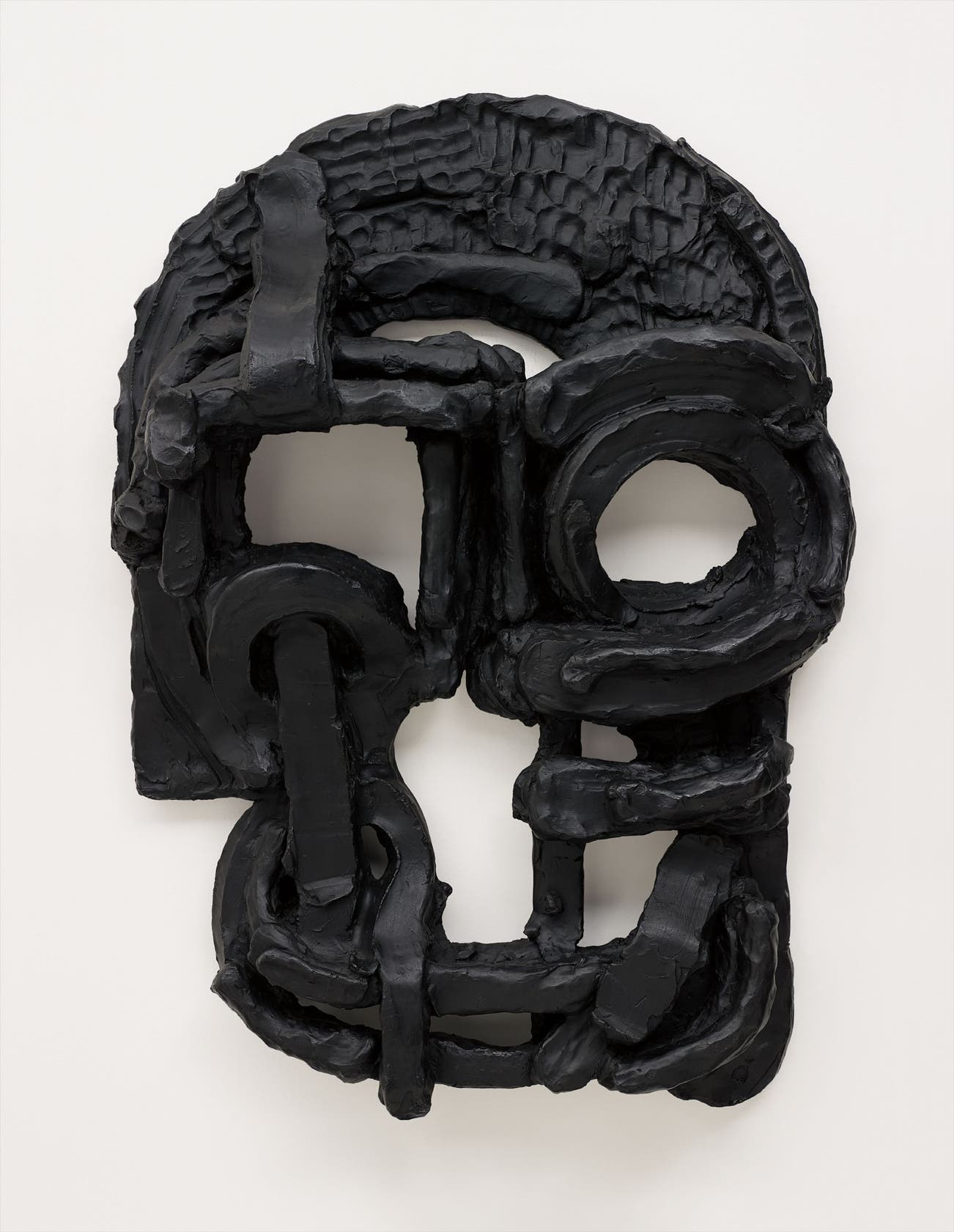 Through S-Mask II, 2011 Thomas Houseago breathes new life into the age-old tradition of figurative sculpture. Participating in a history that dates back to antiquity, Houseago employs metal, hemp and plaster to reinvestigate the formal possibilities of the human form. Through a reductive language, Houseago suggests the essentials of a human face with various appendages and textures. Layered, organic forms mark out an angular jawline and curving masses circle gaping eye sockets. Mounted to a wall, the negative spaces in the face imbue the figure with blank, universalizing anonymity. S-Mask II is an amalgamation of tactile masses and voids that exudes a powerful physical presence, but also suggests the volatility of the human psyche.