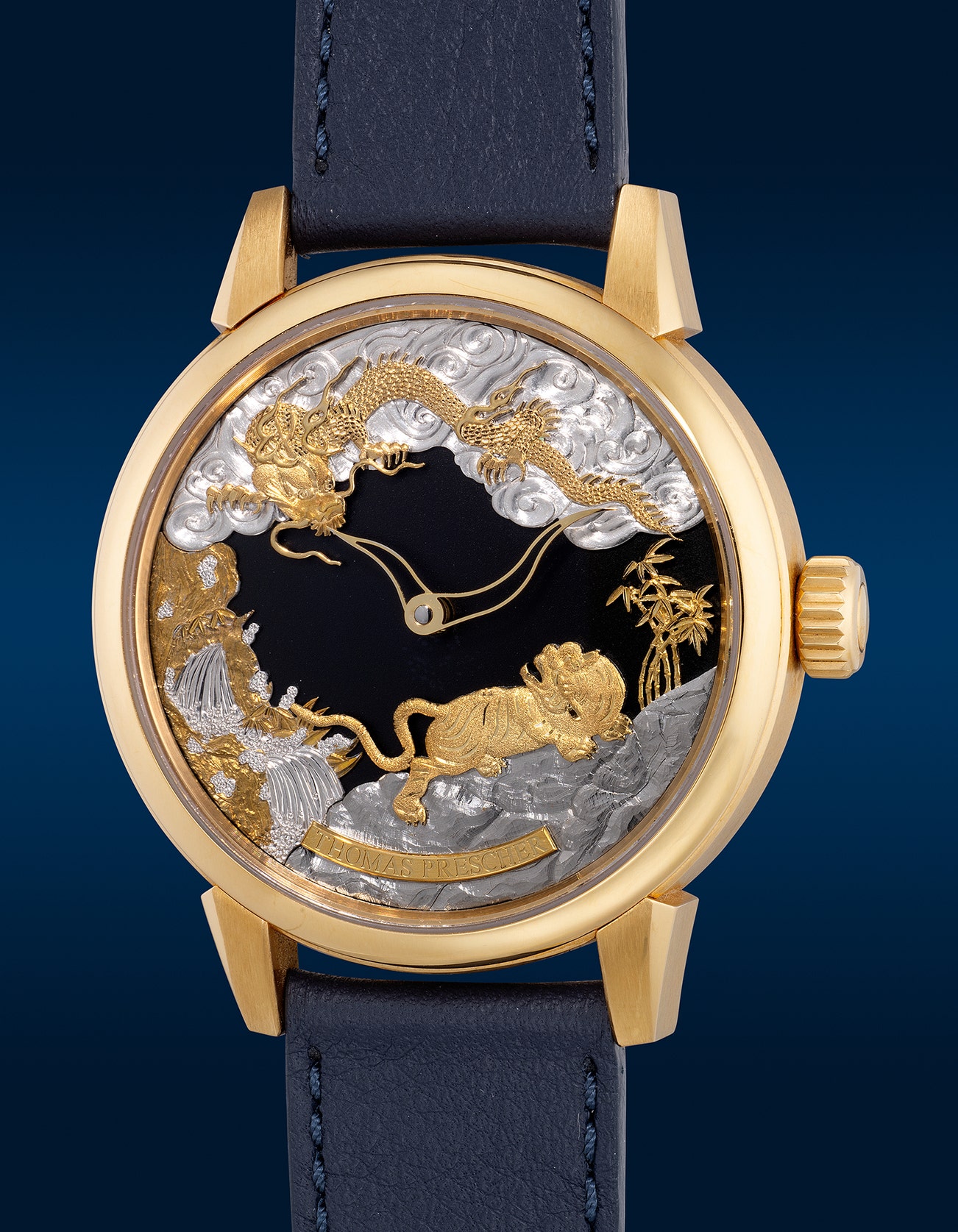 - This unique one-of-a-kind timepiece breaks away from the norm with not one, but two animals gracing the dial. The hand-engraved golden dragon and tiger form a breathtaking scenery against a backdrop of silvered clouds and rock. The enchantment continues when one turns the watch over, revealing the mesmerizing movement engravings visible through the sapphire display back. Even this intricate and captivating feature was handmade by Thomas Prescher himself, exemplifying his commitment to perfection and creating truly exceptional timepieces.