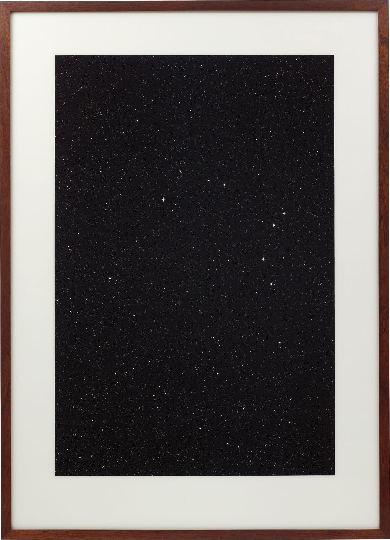 In his Sterne series (1989 -1992), Thomas Ruff takes the objectivity of documentation in photography into a dialogue between reality and art. Using high-resolution negatives obtained from the archives of the European Southern Observatory, Ruff cropped, printed and repositioned the negatives of the night sky above Chile. In the present work, we experience the transformation from scientific document to art, whereby a seemingly objective image is viewed as abstracted beauty. The work confronts us with our tendency to impose what we think we see. When we look at a star in the night sky, we are not seeing the actual star itself, but a trace of light travelling across time and space. And that too is what defines a photograph – light traces on paper of something that no longer exists.