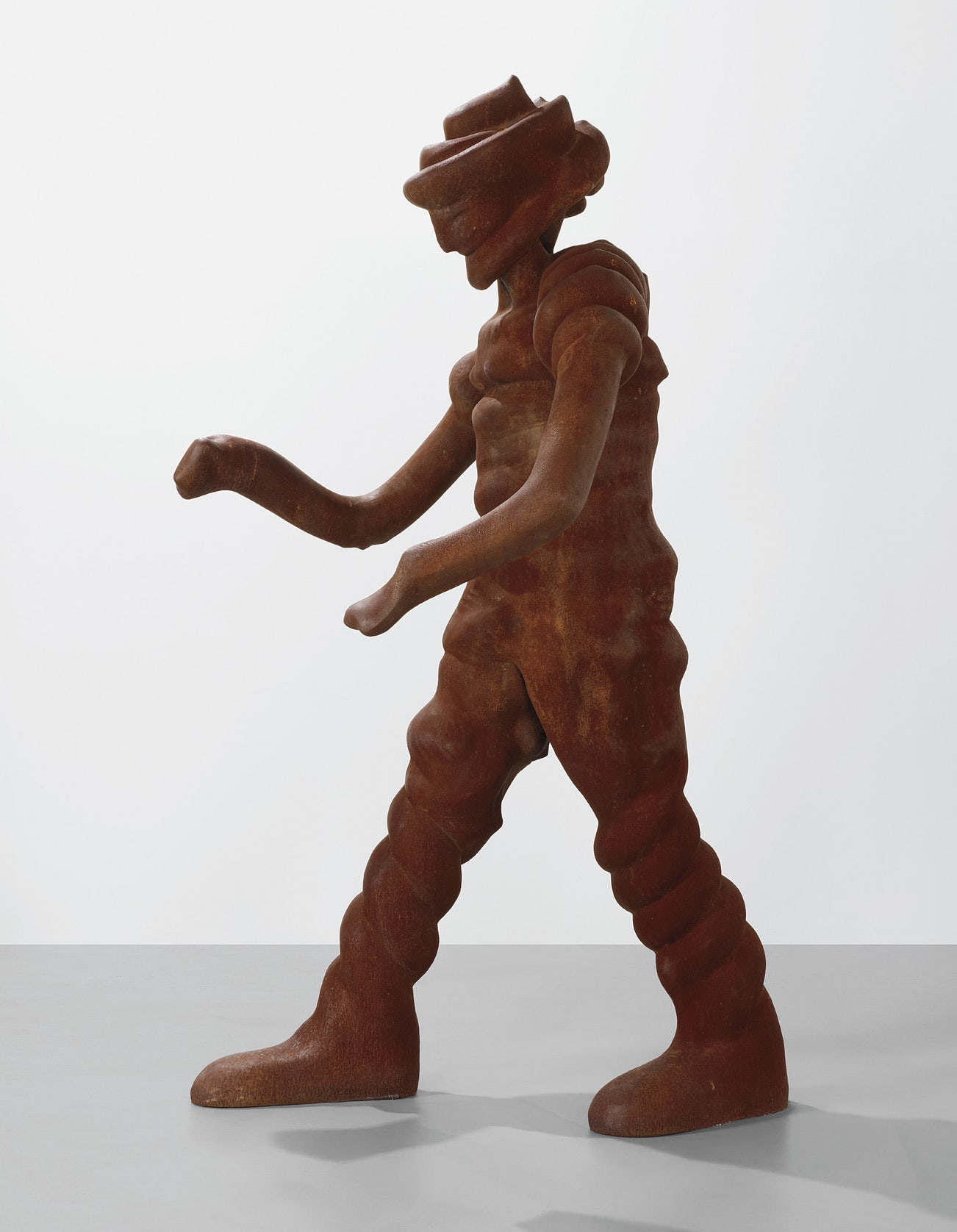 An iconic example of Thomas Schütte’s inimitable sculptural oeuvre, Großer Geist, Nr. 9, 1998, presents us with a colossal monument to the human form. Towering 12 feet above the viewer, the larger than life figure is seemingly caught mid-stride with its arms outstretched. Executed in 1998, Großer Geist Nr. 9 is the ninth of in total 17 figurative sculptures from Schütte’s iconic series Große Geister, 1996-2004. Borne out of the artist’s pleasure in working intuitively with material and scale, all figures from this series, which loosely translates to “Big Spirits” or “Big Ghosts”, were originally formed from long strands of wax and then enlarged and cast in aluminum, bronze, or, as in this work, in corten steel – the most weighty of the three materials, which artistic forebears such as Donald Judd and Richard Serra also employed. Perfectly embodying Schütte’s signature play with contradictions, the imposing mass of Großer Geist, Nr. 9 is belied by the illusion of a cushioned, folded and fluid sculptural surface — one that the observer could perhaps manipulate with his or her own hands. Revealing a careful observation of human anatomy, the anthropomorphic figure’s gestures enliven the sculpture. At once imposing and harmless, fantastical and relatable, human and non-human, Großer Geist, Nr. 9 powerfully illustrates Schütte’s distinct ability to make manifest the contradictions, ambiguities and complexities of the human condition that was awarded the Venice Biennale’s Golden Lion Award in 2005.