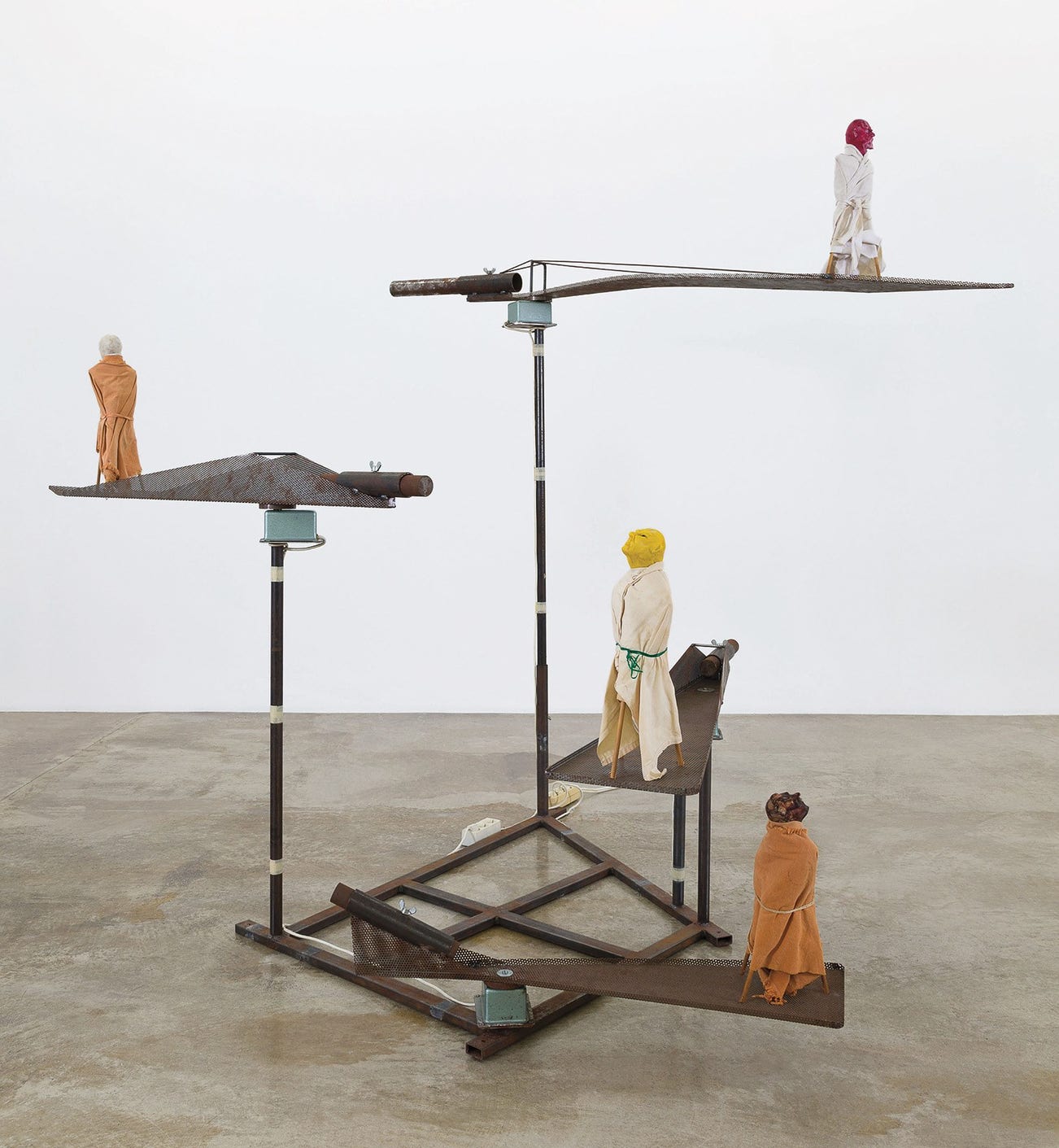 A foremost re-inventor of modern sculpture, Thomas Schütte has forged a singular artistic lexicon that shuns institutionalised modes of classification. Movable and adjustable, Maschine, 1993, is a particularly resourceful example of the German artist’s cross-genre practice. Coalescing buoyant kinetic energy and astounding sculptural detail, the work oscillates between the majestic and the bizarre, the theatrical and the ominous. Its four outlandish figures, swathed in multi-coloured robes bound at the waist, seem like they are subjected to their mechanised structure’s authority, in a gravitational pull that is redolent of Alexander Calder’s elegant stabiles. The viewer is forced to reckon with the work’s ambivalent dynamic, opposing the machine and the creatures’ anthropomorphic silhouettes, which are placed at differing levels atop rotating steel armatures. ‘The things you cannot talk about - these are essential’, Schütte has said. ‘I believe that material, form and color have their own language that cannot be translated. Direct experience is much more touching than media, photographs and so on’ (Thomas Schütte, Thomas Schütte, London, 1998, p. 22). Transcending the act of representation, Maschine posits as pure embodiment; it combines a number of the artist’s most daring idiosyncracies in art, which were most recently celebrated at La Monnaie de Paris in 2019.