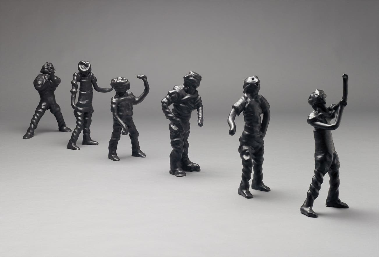 Indeed, solid in medium, yet seemingly fluid in their shape-shifting intensity, the figures convey the impossibility of human communication, and the complexities and contradictions of human behaviour. The very way in which they were constructed is paramount to this: created from long strands of wax that Schütte twisted together in the form of spirals, the figures were immersed in a liquid wax before being cast in bronze and painted black. The malleable wire allows for a true variety of posture, while the wax—a material known for its ability to mimic skin—enables the bronze to approach the supple, life-like quality of flesh. With the sense of mutability and elusiveness infused into their physical state, Sechs Geister is exemplary of the theme of experimentation that pervades the artist’s body of work. It evokes, in the firm and enduring form of sculpture, impermanence and the continuous motion of the body.
