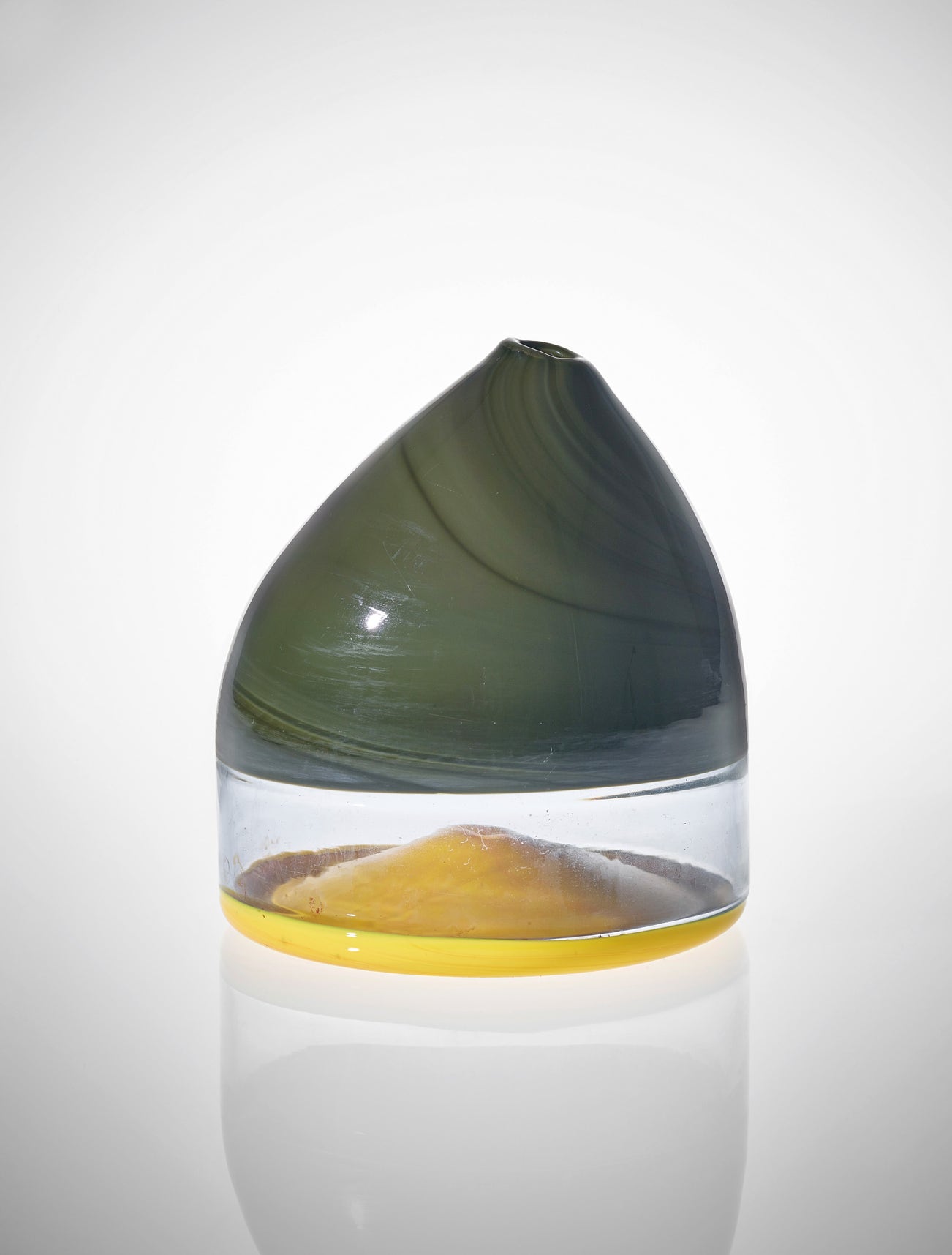 After graduating from the Cranbrook Academy of Art in 1959, Thomas Stearns was granted the Fullbright Travel fellowship by the Italian government and shortly afterwards became the first American to partake in an apprenticeship at Venini. This choice was made by the founder, Paolo Venini, based on flatwork window designs Stearns had produced during his student years at Cranbrook. The artist arrived in Murano in 1959, just missing his advocate who had passed away a few months before. During his time there, the artist worked alongside the maestro ‘Checco’ Ongaro however, the two men often clashed as Stearns had brought with him many new, conceptual ideas that were a far cry from the traditional techniques of the firm. Stearns was fascinated by light and designed many light fittings, alongside the glass vases and sculptures he became well-known for. During his time in Italy he became deeply inspired by the illumination and colour of Venice which is demonstrated in the titles of his most acclaimed works such as, The Sentinel of Venice (circa 1960) and Vessel for The Doge’s Tears (circa 1960). Throughout the four years in the country Stearns did not learn how to speak Italian therefore most of his works were created in isolation and through processes of trial and error. Thus, Stearns’ works may seem unconventional in comparison to other Venini works, characterised by asymmetrical designs in subdued colours (as we see in the present lot) or other larger, sculptural works evoked in broader strokes of colour. Many would argue that this breath of fresh air was welcome in a tumultuous period of Venini history; a time where, with its founder gone, it had to reassess its position. This ability to meld both notions of Abstract Expressionism and Modernism with the seamless elegance of Venini glass led to six of Stearn’s pieces to be chosen for the Venice Biennale in 1962, including the Cappello del Doge vase. Here, the Cappello del Doge is translated as the hat of the highest figure in the Venetian government, which is emulated in the shape of the design. Created with the ancient incalmo technique, made by fusing the edges of the opaque glass and transparent glass pieces requires each diameter to be of the exact same diameter, the vase cannot be mass produced, thus making Stearn’s works inherently unique. This ‘playful interpretation’ of a ‘quintessential icon’ (Susan Sacks, ‘Thomas Stearns’, Marino Barovier, ed., Venetian glass: The Nancy Olnick and Giorgio Spanu Collection, New York, 2000, p. 27) is characteristic of the American artist’s work and what renders his pieces so identifiable. For his work at the Venice Biennale, Stearns was awarded the ‘Best of Show’ Award, an achievement never before bestowed to an American and was in fact later rescinded, as soon as the judges became aware of his monolingual nationality. The artist’s transition from functional glass to glass as sculpture is now seen as a precursor to the Studio Glass movement, where glass was seen as an artistic medium with a sculptural or decorative rather than functional statement. Towards the end of 1962 Stearns moved to New York to research the use of plastics in art and took up teaching sculpture at the Philadelphia College of Art, indicating his desire to take his glass creations to a new level. Stearn’s pieces have previously been exhibited at the Solomon R. Guggenheim Museum in New York and The Pennsylvania Academy of Arts. This striking piece represents a significant period in the artist’s career and would make a beautiful addition to any collection.