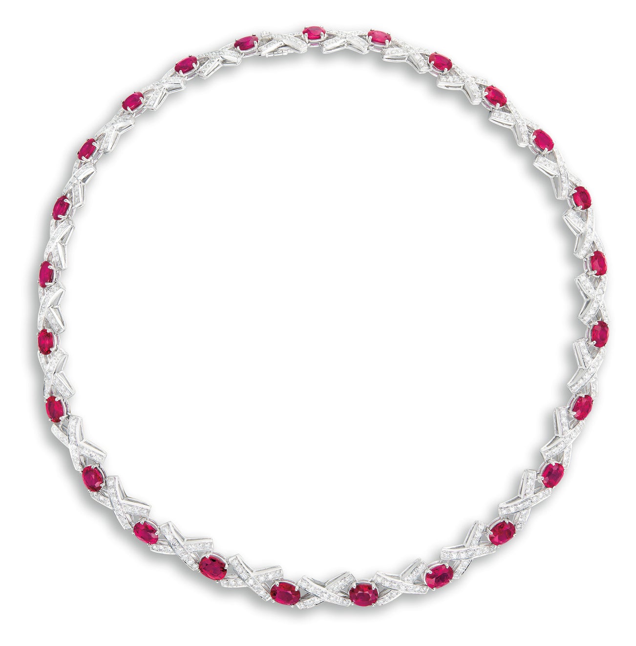 Twenty-five rubies, totalling 30.24 caratsSpaced by diamond-set X-shaped links, diamonds totalling approximately 9.70 caratsPlatinumSigned <em>Paloma Picasso</em> and <em> 1986 Tiffany & Co.</em><em>With a signed pouch</em>(Twenty-five Rubies) <em>SSEF report, numbered 101092, dated 28 June 2018, Burma, no indications of heating.</em>
