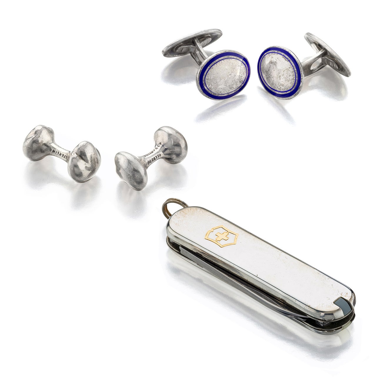 Comprising a silver and enamel pair of cufflinks, a silver and gold pocket knife, and an Elsa Peretti for Tiffany & Co. 'Bone Nugget' pair of cufflinks
