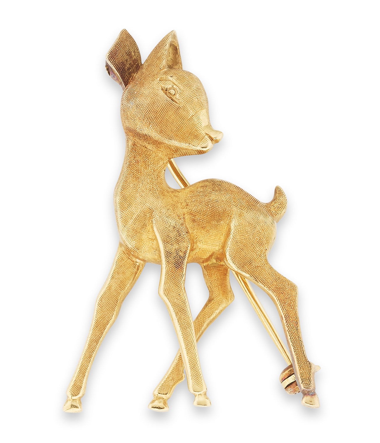 Modelled as a fawn, measuring approximately 40 x 25mm, signed Tiffany & Co, French import mark for gold.