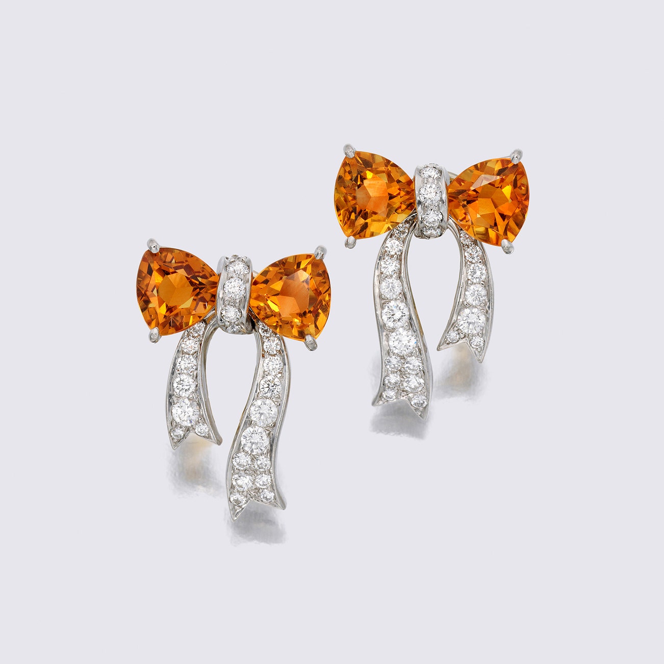 Of a bow design, set with triangular-shaped citrines, accented by brilliant-cut diamonds, mounted in platinum, length approximately 1 inch, signed Tiffany & Co..